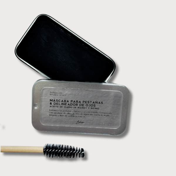 Máscara de pestañas, delineador de ojos y delineador de cejas. Formulado con aceite de ricino, aceite de hueso de mamey, jojoba y vitamina E.